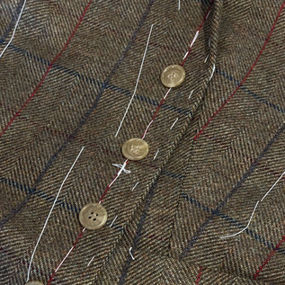In discussing its future use, we made a few changes to the style. Since I contemplated wearing the vest without a jacket, we added a collar and lapels. The pockets were positioned and one of them designated to fit a cellphone. Fabrics and lining material were chosen, buttons picked, and a muslin was made.